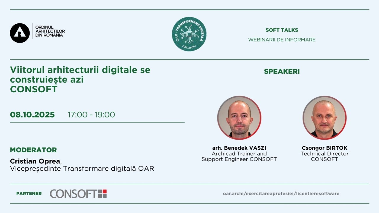 Webinarul susținut de Consoft cu titlul „Viitorul arhitecturii digitale se construiește azi” a avut ca subiecte principale: Prezentarea noii versiuni Archicad 29, cu funcționalități care simplifică și accelerează procesul de proiectare, Graphisoft AI Assistant – primul asistent bazat pe inteligență artificială integrat în Archicad, Lansarea națională a noului produs Graphisoft MEP Designer, dedicat proiectării instalațiilor direct în Archicad, precum și prezentarea în premieră a noilor Add-onuri dezvoltate de CONSOFT, create pentru a răspunde nevoilor concrete ale arhitecților din România.