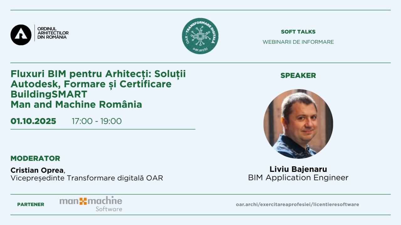 Webinarul susținut de Man and machine România cu numele de „Fluxuri BIM pentru Arhitecți: Soluții Autodesk, Formare și Certificare BuildingSMART” va trece în revistă fluxuri BIM care se dovedesc productive în munca architecților restituind un timp valoros pentru creativitate, abordări utile în adopția de soft în birourile de architectură, și planuri de instruire care țintesc modelarea, coordonarea si managementul BIM, atât pentru a ține pasul cu rigorile industriei, cât și pentru a obține recunoaștere profesională la nivel internațional (certificare Autodesk, certificare BIM Ready, Certificare BuildingSMART).
