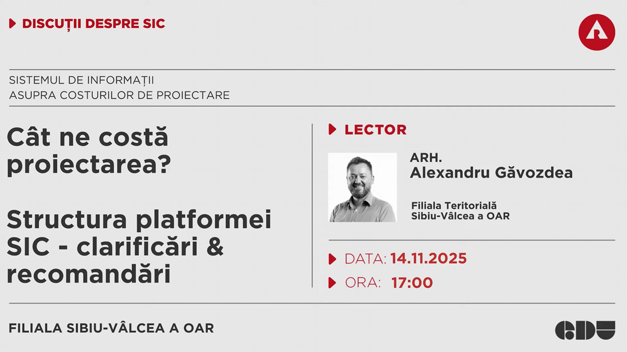 Întâlnirea a fost susținută de arh. Alexandru Găvozdea și a avut ca temă Sistemul de Informații asupra Costurilor de Proiectare (SIC), cu accent pe modul de funcționare al platformei, logica de calcul a costurilor de proiectare și recomandări practice pentru utilizarea acesteia în activitatea profesională. Discuția a abordat atât aspecte tehnice, cât și situații concrete din practică, oferind repere clare pentru înțelegerea onorariilor de proiectare.