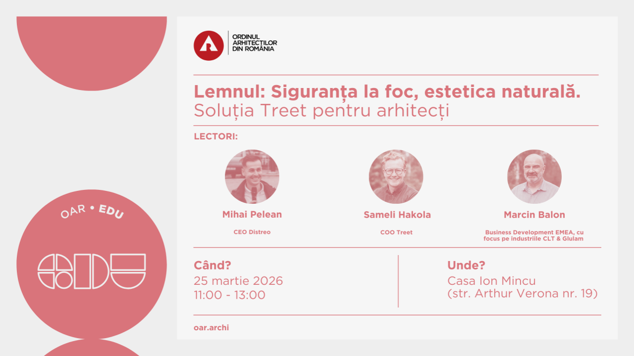 Cursul „Lemnul: Siguranța la foc, estetica naturală. Soluția Treet pentru arhitecți” a fost prezentat de Mihai Pelean (CEO Distreo), împreună cu Sameli Hakola (COO Treet) și Marcin Balon (Business Development EMEA), oferind participanților informații despre soluțiile Treet certificate pentru lemn, cu accent pe siguranță la incendiu, protecția texturii naturale și sustenabilitate în proiectele arhitecturale.